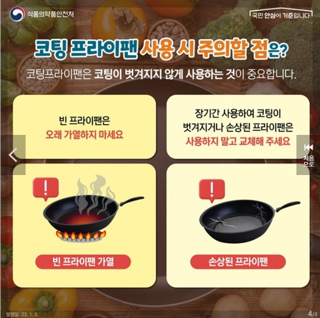 빈 프라이팬은 오래 가열하지 말자. 장기간 사용하여 코팅이 벗겨지거나 손상된 프라이팬은 사용하지 말고 교체!
