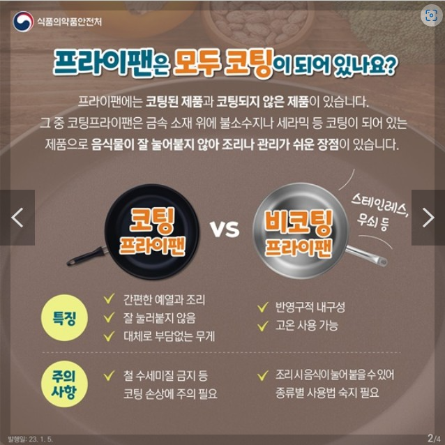 - 그중 코팅프라이팬은 금속 소재 위에 불소수지나 세라믹 등 코팅이 되어 있는 제품으로 음식물이 잘 눌어붙지 않아 조리나 관리가 쉬운 장점이 있다.