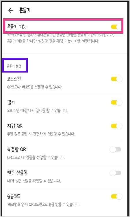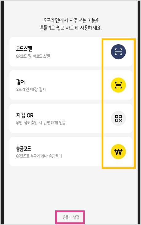 카톡에서 흔들어 주세요~"코드 스캔, 결제, 무인점포 출입, 송금받기" 바로 선택할 수 있어요!