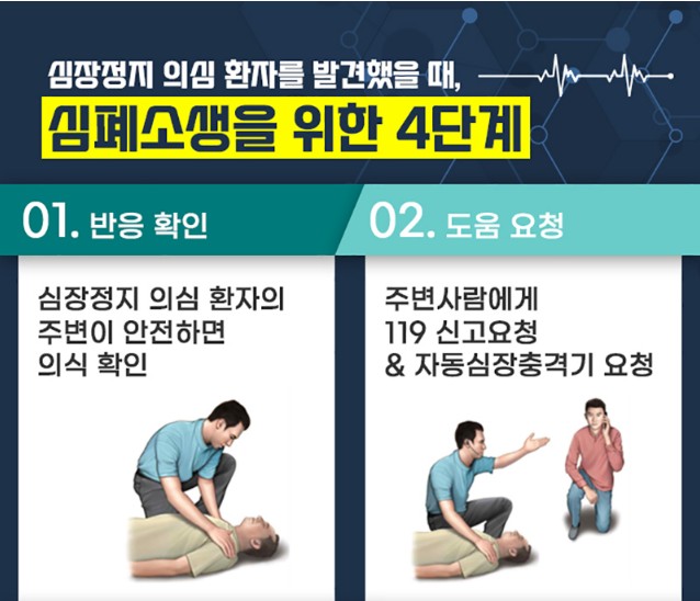 | 심장정지 의심 환자를 발견했을 때, 심폐소생을 위한 4단계 |
