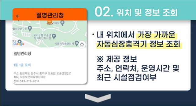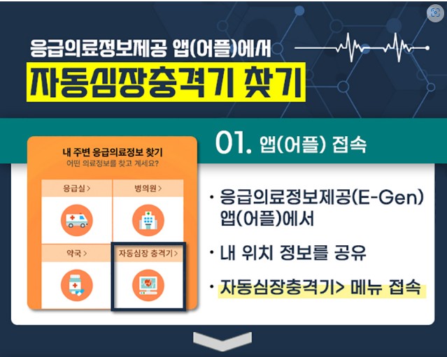 인터넷에서 ‘자동심장충격기 찾기’를 검색하면, 중앙응급의료센터에서 운영하는 “E-Gen(응급의료포털)”에서 자동심장충격기를 지도에서 찾을 수 있습니다. 휴대폰에서도 ‘응급의료 정보제공’ 앱(어플)을 다운로드하고 위치를 설정하면 주변에서 가장 가까운 자동심장충격기 위치를 확인할 수 있습니다.