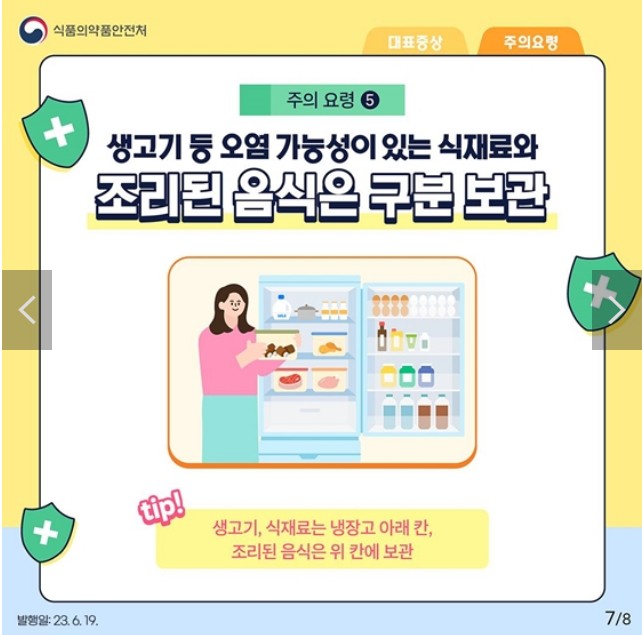 - 5. 생고기 등 오염 가능성이 있는 식재료와 조리된 음식은 구분 보관