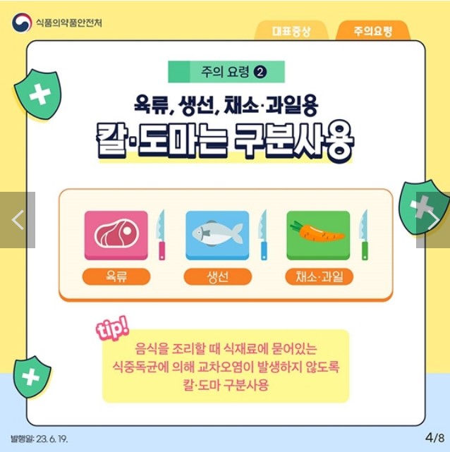 <tip> 음식을 조리할 때 식재료에 묻어있는 식중독균에 의해 교차오염이 발생하지 않도록 칼·도마 구분 사용