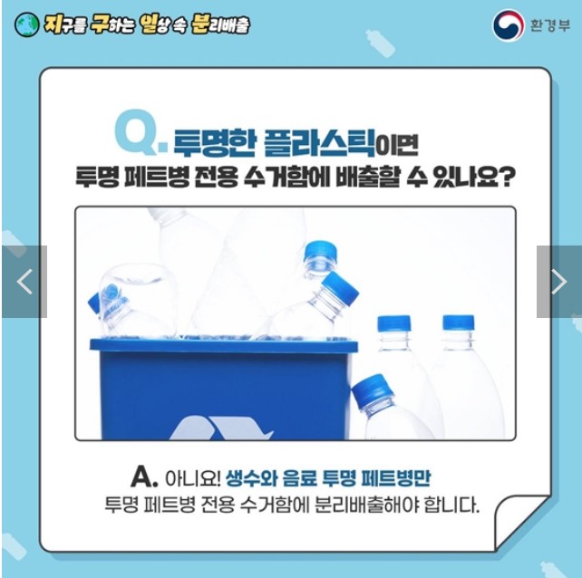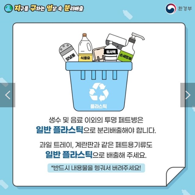 생수 및 음료 이외의 투명 페트병은 일반 플라스틱으로 분리배출해야 합니다.