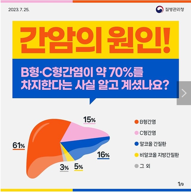 우리나라 암 종류별 사망원인 2위인 간암의 원인으로B형 간염과 C형 간염이 약 70%를 차지하는 것으로 알려져 있습니다.