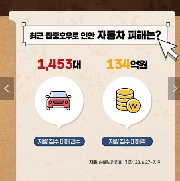 - 1,453대 (차량 침수 피해 건수), 134억 원 (차량 침수 피해액)