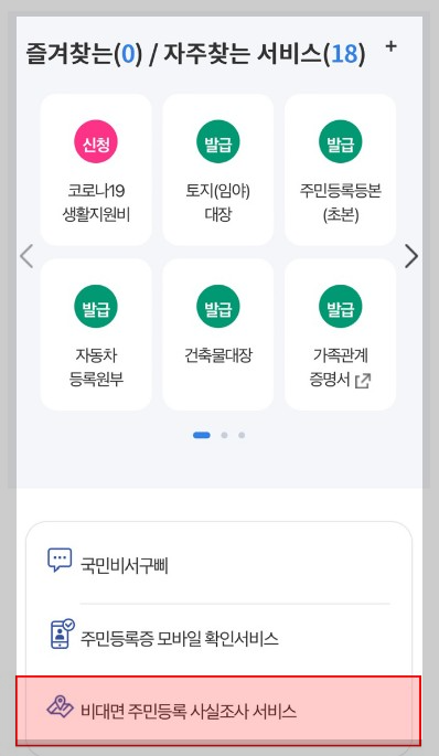 - 정부24앱의 메인 화면에서 비대면 주민등록 사실조사 서비스 바로가를 클릭합니다.