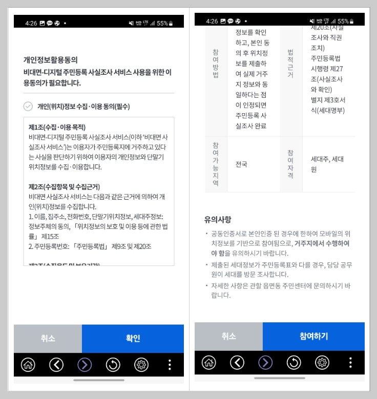 비대면 사실조사 참여는 정부24 앱을 통해서만 가능하여 PC 환경에서는 진행하실 수 없습니다.