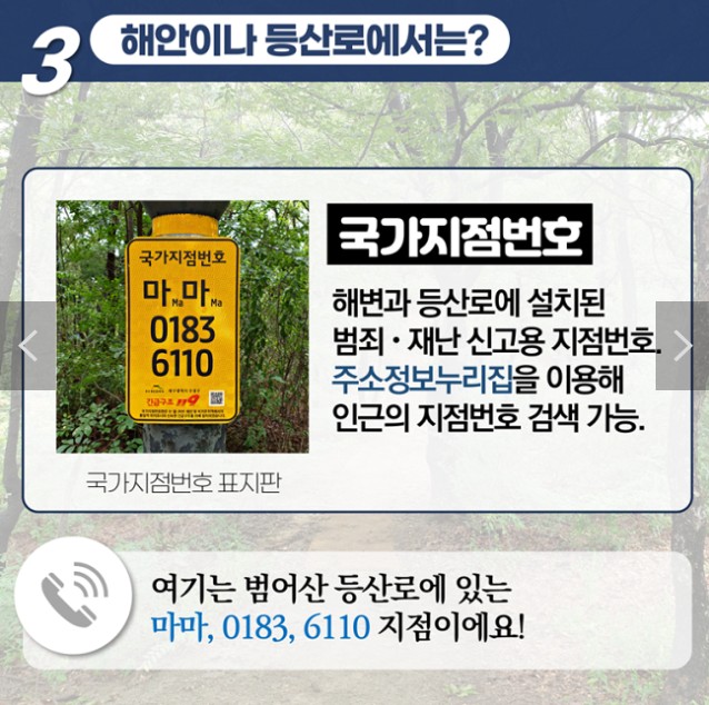 - 해변과 등산로에 설치된 범죄·재난 신고용 지점번호.