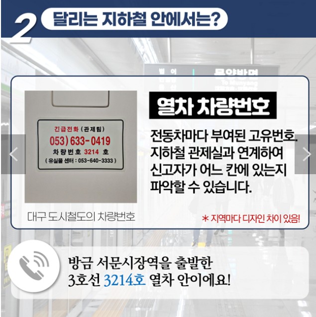 - 지하철 관제실과 연계하여 신고자가 어느 칸에 있는지 파악할 수 있습니다.