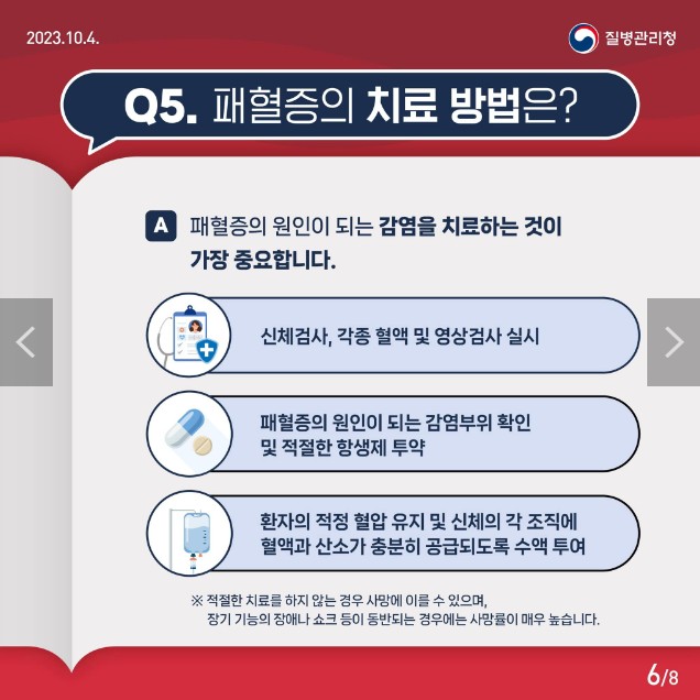 - 패혈증의 원인이 되는 감염부위 확인 및 적절한 항생제 투약