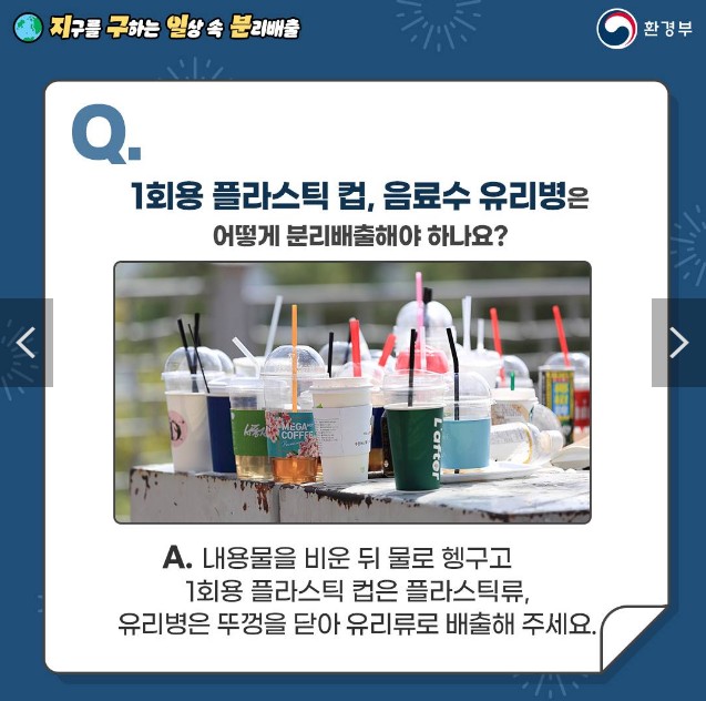 - A. 내용물을 비운 뒤 물로 헹구고 1회용 플라스틱 컵은 플라스틱류, 유리병은 뚜껑을 닫아 유리류로 배출해 주세요.