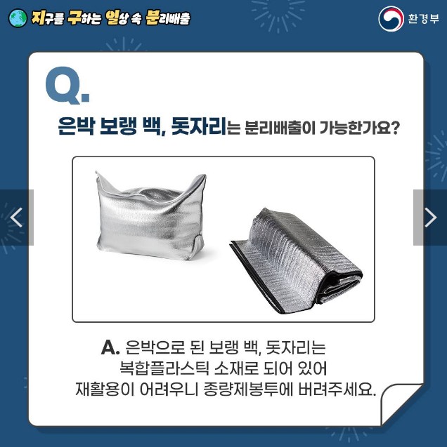 - A. 은박으로 된 보랭 백, 돗자리는 복합플라스틱 소재로 되어 있어 재활용이 어려우니 종량제봉투에 버려주세요.