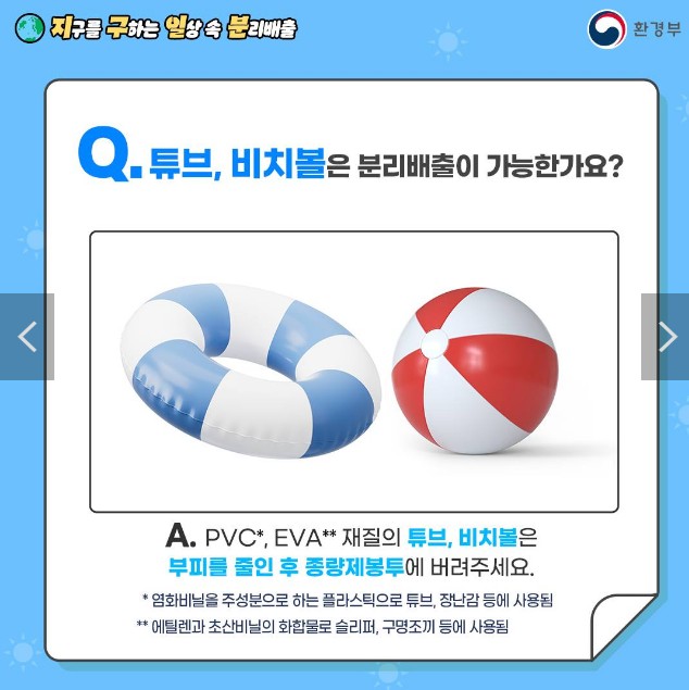 - A. PVC*, EVA** 재질의 튜브, 비치볼은 부피를 줄인 후 종량제봉투에 버려주세요.