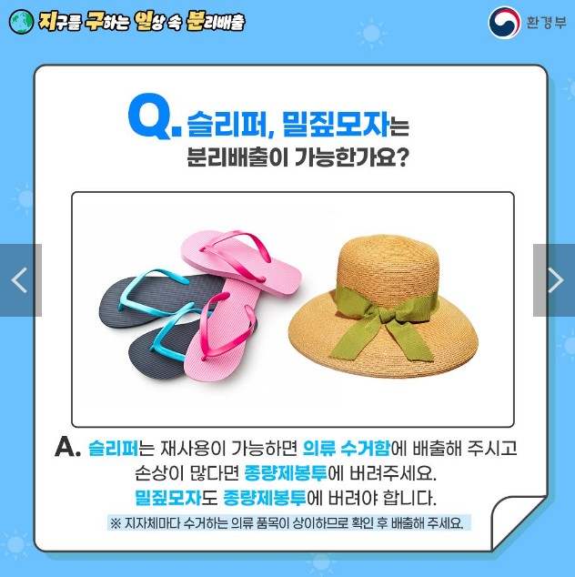 - A. 슬리퍼는 재사용이 가능하면 의류 수거함에 배출해 주시고 손상이 많다면 종량제봉투에 버려주세요.