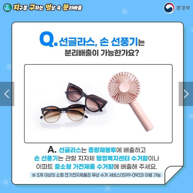 - A. 선글라스는 종량제 봉투에 배출하고 손선풍기는 관할 지자체 행정복지센터 수거함이나 아파트 중소형 가전제품 수거함에 배출해 주세요.
