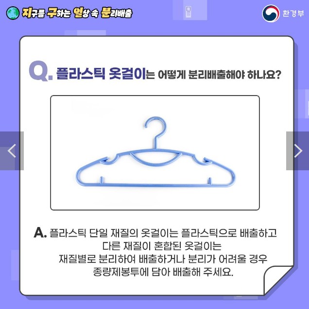 - A. 플라스틱 단일 재질의 옷걸이는 플라스틱으로 배출하고 다른 재질이 혼합된 옷걸이는 재질별로 분리하여 배출하거나 분리가 어려울 경우 종량제봉투에 담아 배출해 주세요.