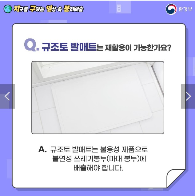 - A. 규조토 발매트는 불용성 제품으로 불연성 쓰레기봉투(마대 봉투)에 배출해야 합니다.
