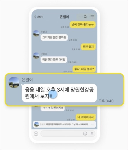 뭐였더라... 모임 장소나 일정을 확인하려다 보면 모임 톡방을 여러 번 쓸어내리고 또 쓸어 올리게 됩니다. 검색에서 내용을 찾으려 하니 바로바로 눈에 띄지도 않아요. 띄어쓰기가 다르면 검색도 안 되고, 키워드를 한 글자로 하면 이건 또 시간이 오래 걸리지요.