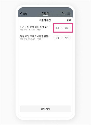 STEP 5. 책갈피 설정을 2개 이상했다면, '책갈피 편집'에서 기존 책갈피를 관리(수정 및 해제)할 수 있어요.