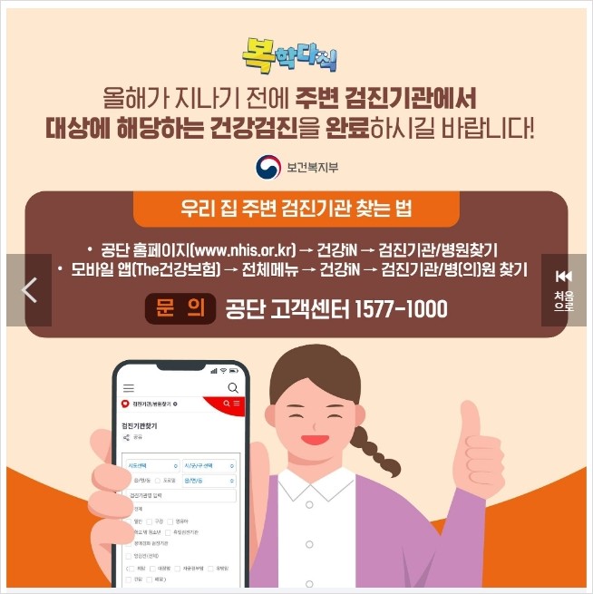☞ 검진기관/병원찾기 바로가기 https://www.nhis.or.kr/nhis/healthin/retrieveExmdAdminSearch.do