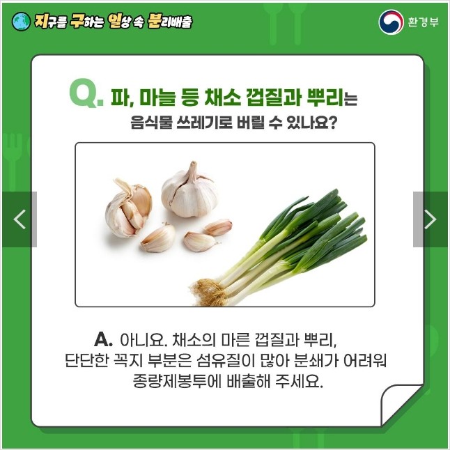 | Q. 파, 마늘 등 채소 껍질과 뿌리는 음식물 쓰레기로 버릴 수 있나요? |