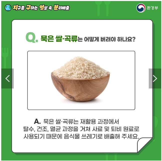 - A. 묵은 쌀·곡류는 재활용 과정에서 탈수, 건조, 멸균 과정을 거쳐 사료 및 퇴비 원료로 사용되기 때문에 음식물 쓰레기로 배출해 주세요.