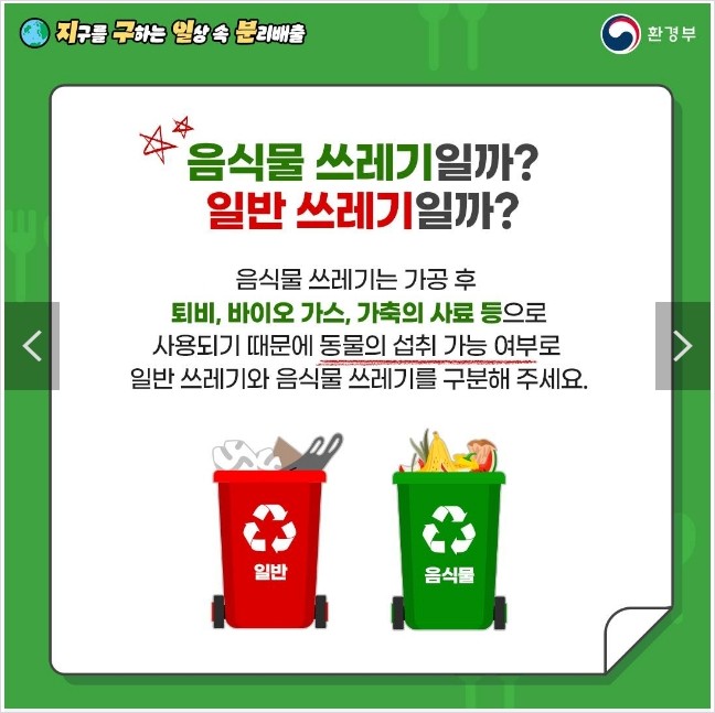 동물의 섭취 가능 여부로 일반 쓰레기와 음식물 쓰레기를 구분해 주세요.