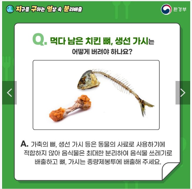 - A. 가축의 뼈, 생선 가시 등은 동물의 사료로 사용하기에 적합하지 않아 음식물은 최대한 분리하여 음식물 쓰레기로 배출하고 뼈, 가시는 종량제봉투에 배출해 주세요.