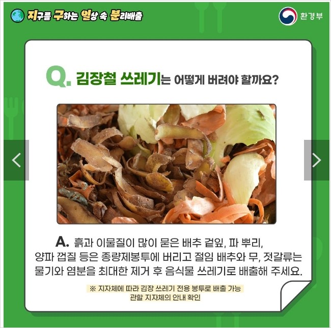 - A. 흙과 이물질이 많이 묻은 배추 겉잎, 파뿌리, 양파 껍질 등은 종량제봉투에 버리고 절임 배추와 무, 젓갈류는 물기와 염분을 최대한 제거 후 음식물 쓰레기로 배출해 주세요.