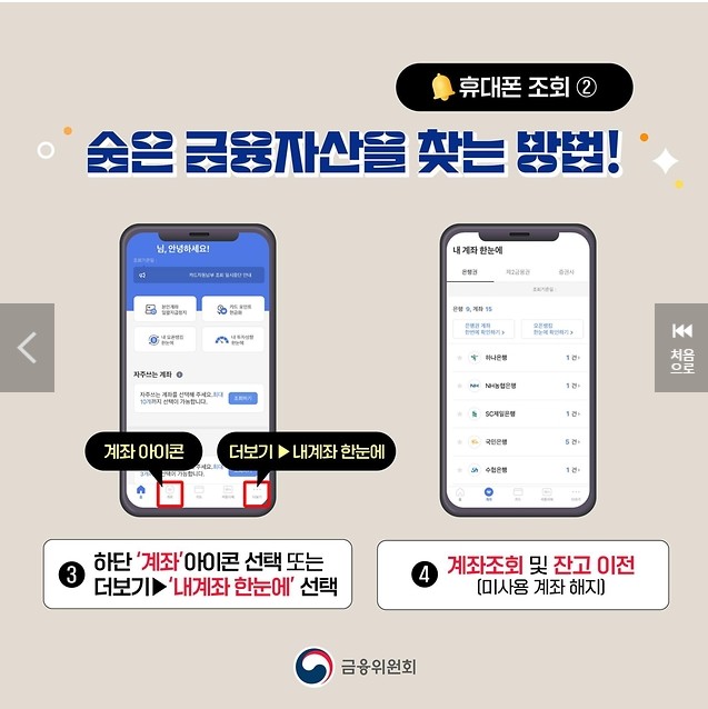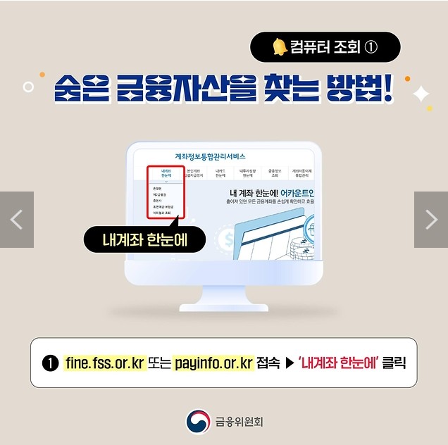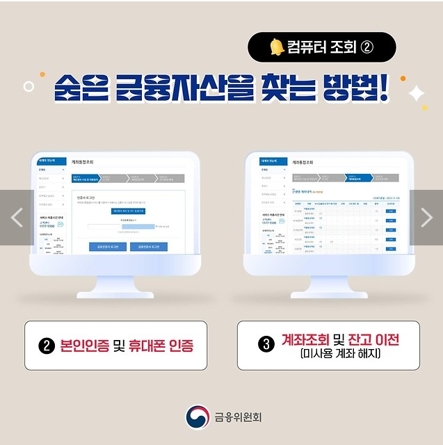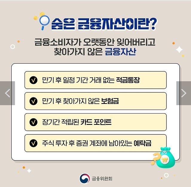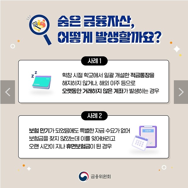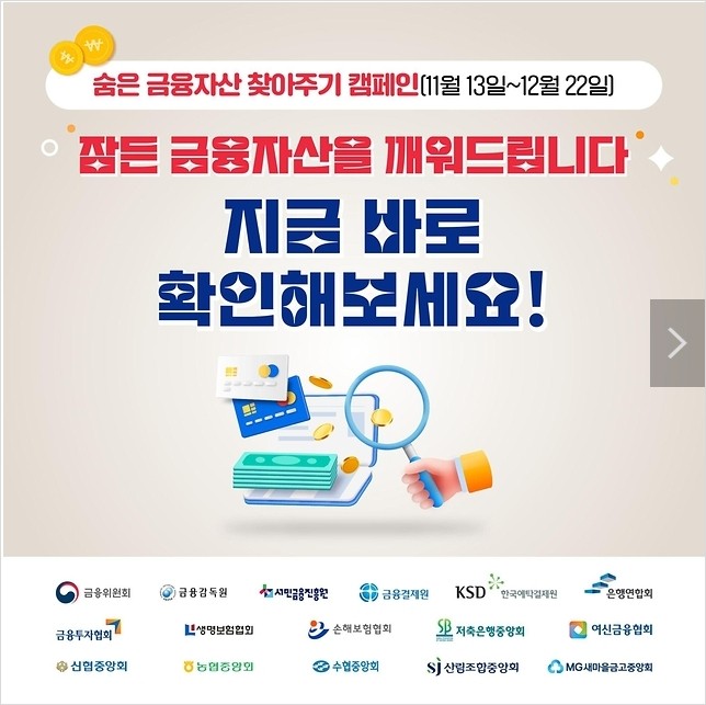 금융위원회는 유관기관과 함께 11월 13일부터 12월 22일까지 ‘숨은 금융자산 찾아주기 캠페인’을 실시!