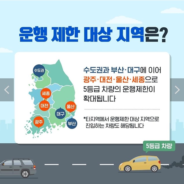 - 수도권과 부산·대구에 이어 광주·대전·울산·세종으로 5등급 차량의 운행제한이 확대됩니다