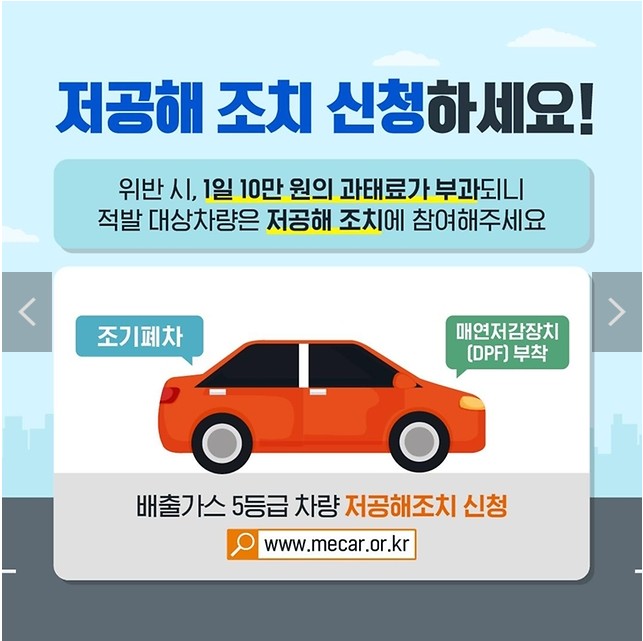 - 위반 시, 1일 10만 원의 과태료가 부과되니 적발 대상차량은 저공해 조치에 참여해주세요.