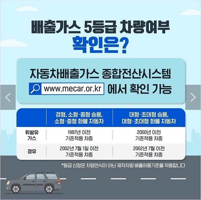 「자동차 배출가스 등급 산정방법에 관한 규정」에 따라 모든 차량을 유종/연식/오염물질의 배출 정도에 따라서 1~5등급으로 분류하는 제도