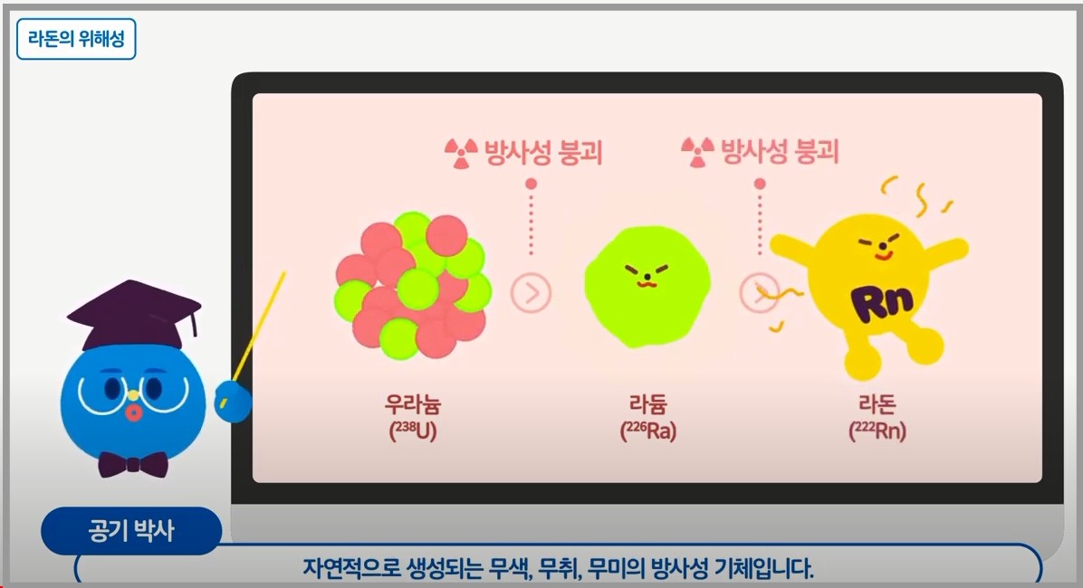 자연적으로 생성되는 무색, 무취, 무미의 방사성 기체로 고체인 우라늄이나 라듐과 달리 라돈은 기체이기 때문에 우리 폐에 드나들 수 있는 위험 존재이다.
