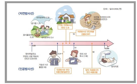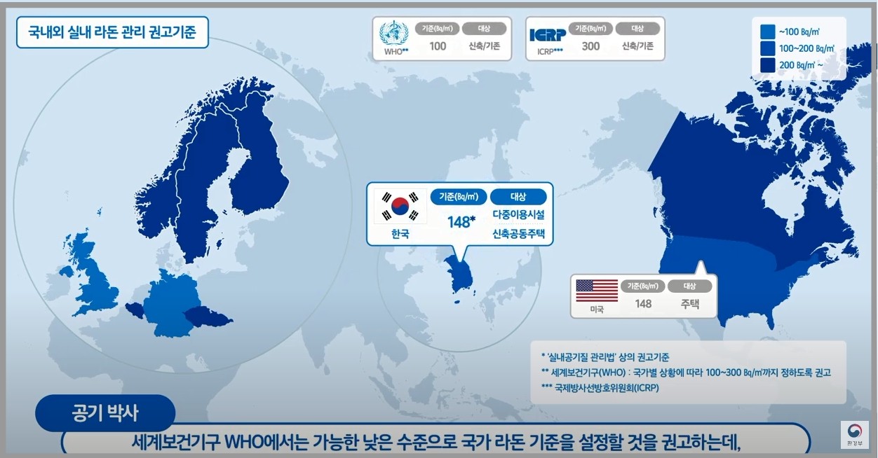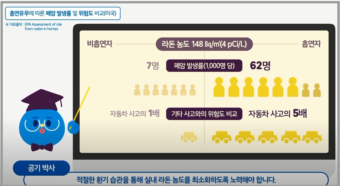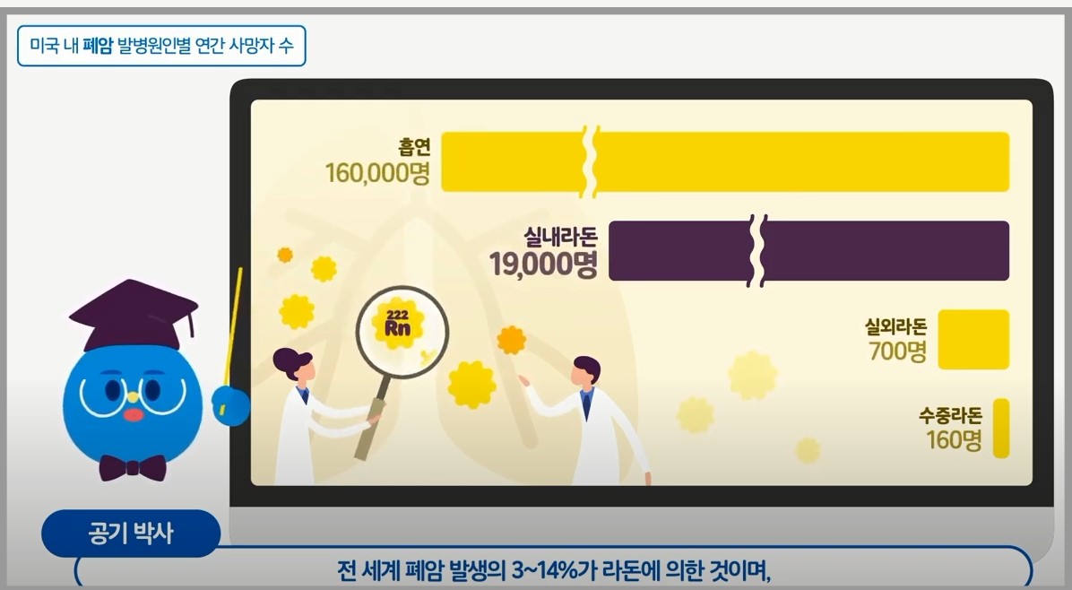 "사람이 연간 노출되는 방사선의 82%는 자연방사선에 의한 것이고, 그중에서 대부분은 라돈에 의한 것이다."