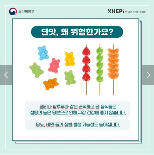 젤리나 탕후루와 같은 끈적하고 단 음식들은 설탕의 높은 당분으로 인해 구강 건강에 좋지 않습니다. 당뇨, 비만 등의 질병 발생 가능성도 높아집니다.