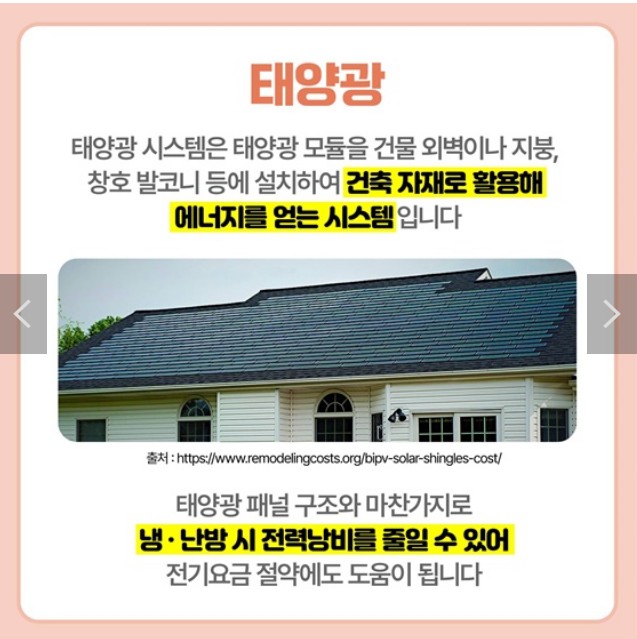 - 태양광 시스템은 태양광 모듈을 건물 외벽이나 지붕, 창호 발코니 등에 설치하여 건축 자재로 활용해 에너지를 얻는 시스템입니다. 태양광 패널 구조와 마찬가지로 냉·난방 시 전력낭비를 줄일 수 있어 전기요금 절약에도 도움이 됩니다.