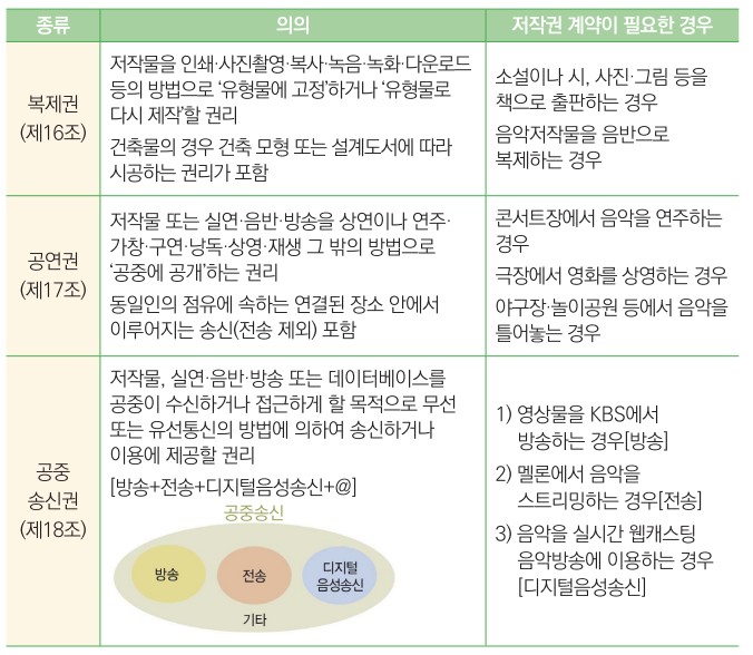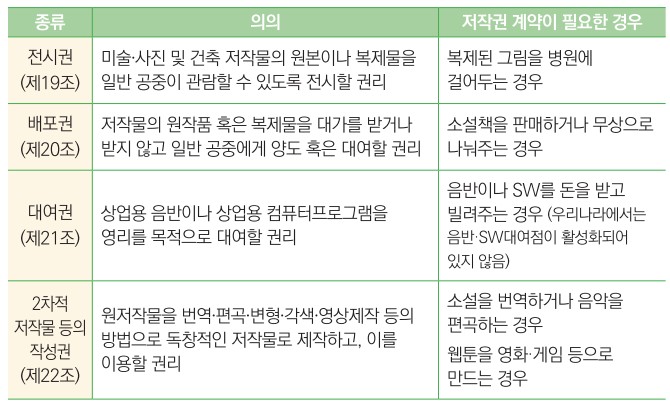 ▷ 저작재산권: 복제권, 공연권, 대여권, 공중송신권, 배포권, 전시권, 2차적 저작물 작성권