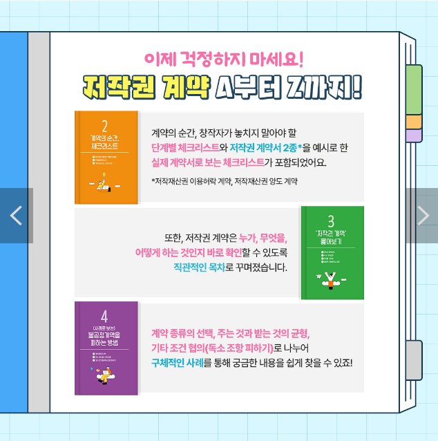 - ① 계약의 순간, 창작자가 놓치지 말아야 할 단계별 체크리스트와 저작권 계약서 2종*을 예시로 한 실제 계약서로 보는 체크리스트가 포함되었습니다.