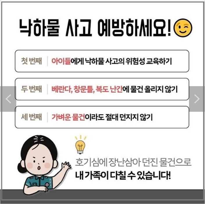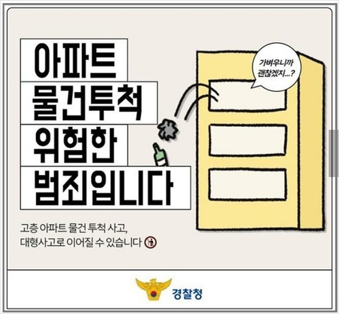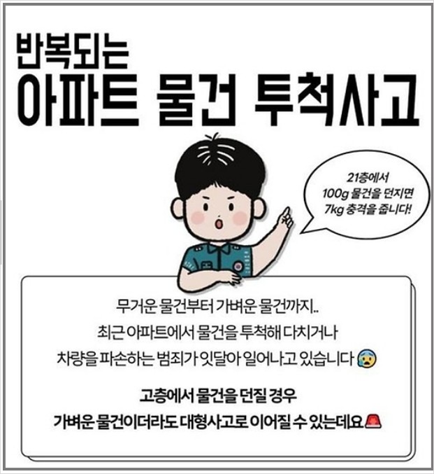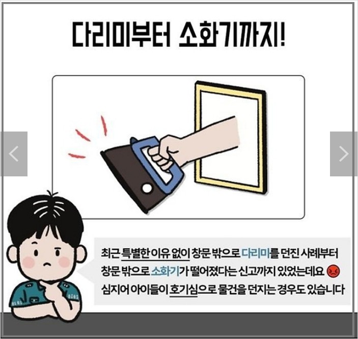 최근 특별한 이유 없이 창문 밖으로 다리미를 던진 사례부터 창문 밖으로 소화기가 떨어졌다는 신고까지 있었는데요. 심지어 아이들이 호기심으로 물건을 던지는 경우도 있습니다.
