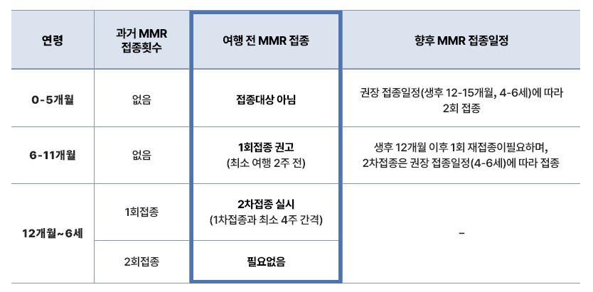 • 면역의 증거*가 없는 청소년 및 성인의 경우, 출국 4~6주 전 MMR 백신 2회 접종(최소 4주 간격) 완료를 권고한다.