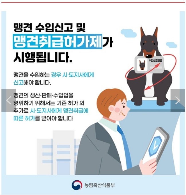 - 맹견의 생산·판매·수입업을 영위하기 위해서는 기존 허가 외 추가로 시·도지사에게 맹견취급에 따른 허가를 받아야 합니다.