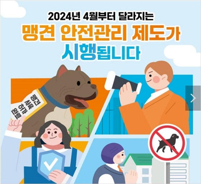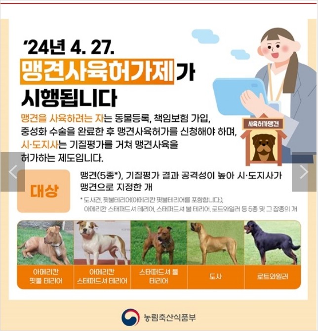 ※ 기존에 맹견(5종)을 사육하는 소유자는 시행일(’ 24.4.27.) 이후 6개월 이내에 맹견사육허가를 받아야 합니다.