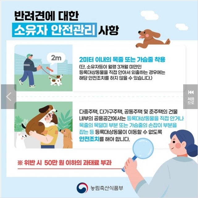 - 월령 3개월 이상의 맹견을 데리고 외출할 때 목줄, 입마개 등 안전조치를 취하여야 합니다.