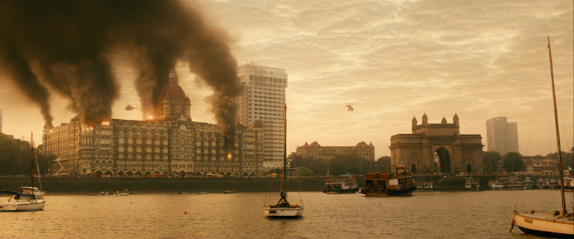 인도 뭄바이는 2천만 명 이상이 거주하는 대도시로 인도의 증권거래소가 자리하고 있고, 인도 영화계를 전 세계로 알린 볼리우드가 시작된 곳으로 인도의 금융, 대중문화의 수도라 할 수 있다. 세계적인 대도시가 그렇듯이 이 도시 역시 위험한 공격에 노출되기도 한다. 2008년 11월 26일부터 29일, 3일간 이 도시가 테러단의 손에 넘어갔다. 훔친 낚싯배를 타고 이곳에 들어온 젊은 테러단은 도시 중심부에 무차별 총격과 폭탄 테러를 감행한다. 이러한 공격에 대비하지 못한 경찰이 힘을 쓰지 못하는 사이, 주민들과 관광객들은 안전한 피난처를 찾아 고군분투했고 그중 대표적인 곳이 바로 타지 호텔이다.
