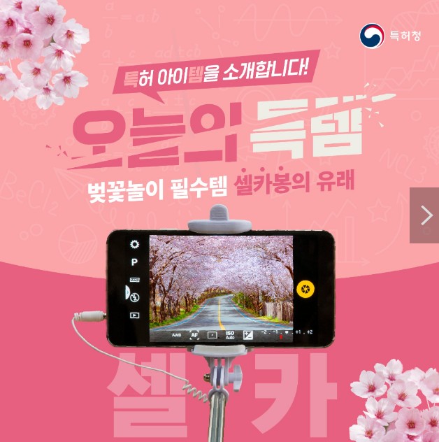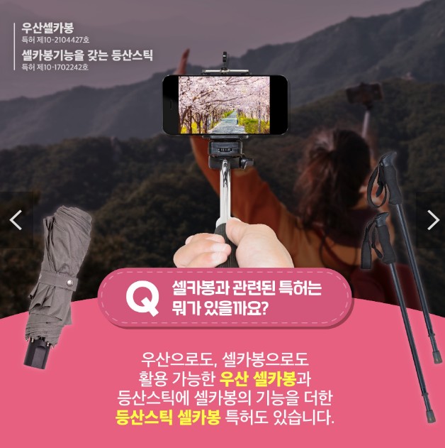 - 우산으로도, 셀카봉으로도 활용 가능한 우산 셀카봉과 등산스틱에 셀카봉의 기능을 더한 등산스틱 셀카봉 특허도 있습니다.