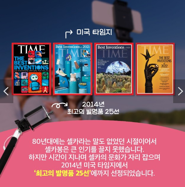하지만 시간이 지나며 셀카의 문화가 자리 잡으며 2014년 미국 타임지에서 ‘최고의 발명품 25선’에까지 선정되었습니다.