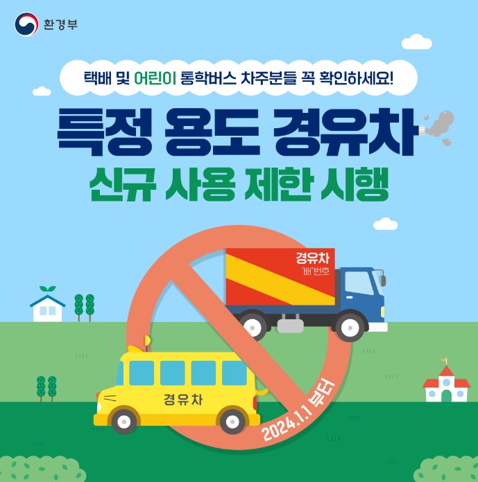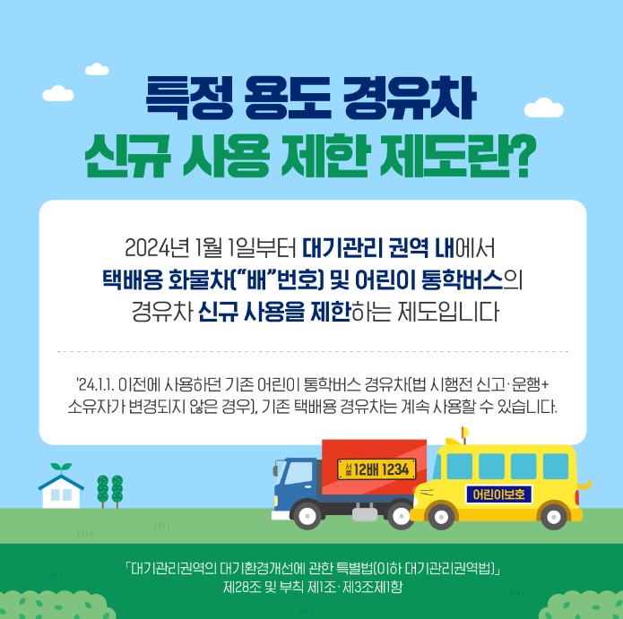 2024년 1월 1일부터 대기관리 권역 내에서 택배용 화물자("배"번호) 및 어린이 통학버스의 경유차 신규 사용을 제한하는 제도입니다.