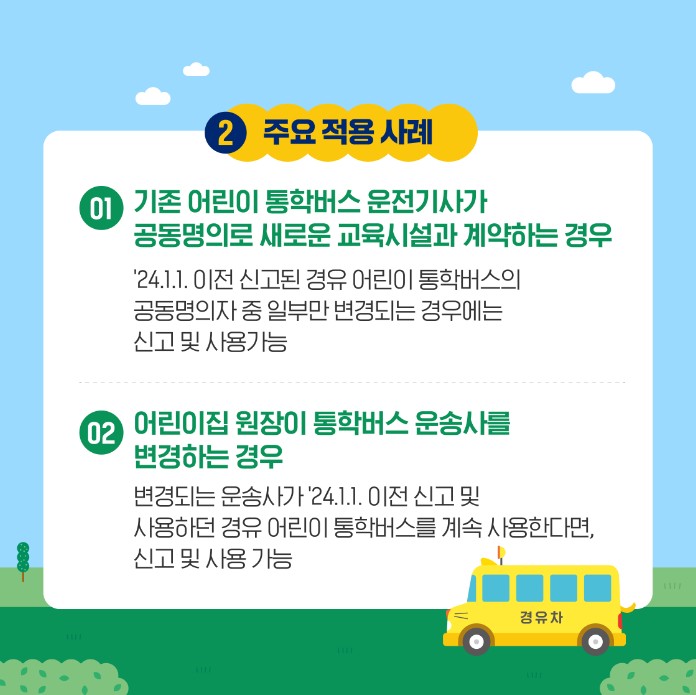 2024.1.1. 이전 신고된 경유 어린이 통학버스의 공동명의자 둥 일부만 변경되는 경우에는 신고 및 사용가능 - 02. 어린이집 원장이 통학버스 운송사를 변경하는 경우
